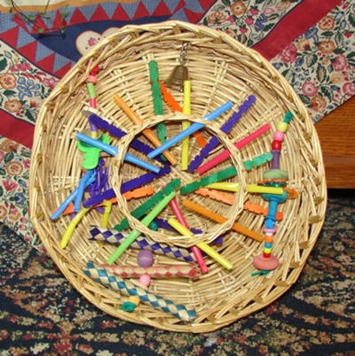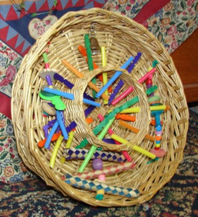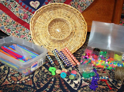 Make up three strings of assorted items and thread them through the basket. Add the stainless bell. Take the straws, squiggle several to add to the chains and then thread them through the basket. This is tons of fun and you get to practice your weaving techniques!