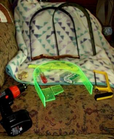 Here are the three Macaw swing frames: one was metal and I attached a wooden perch, the dark blue frame was not broken and will add to it another day, the bright lime green with broken with a bit snapped off the end.