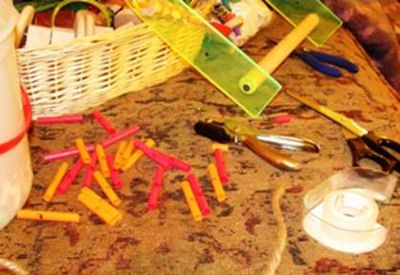 Straws cut up and punched. To make threading the rope easier, cut off the end and wrap with a small amount of clear tape.