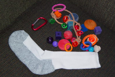 • With a full-length sock, roll the top down to place toys, nuts, and paper items in toe to heel area